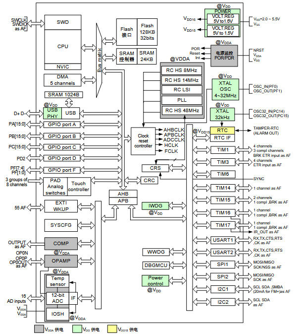 2. USB 應用時,VDD 范圍 2.0~3.6 V,超出必須 LDO;否則 D+/D- 眼圖失敗。