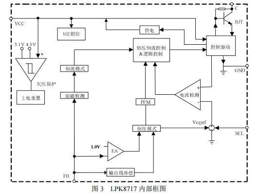 LPK8717是芯茂微推出的一款高集成度原邊反饋控制芯片,采用SOP-8封裝,內(nèi)置750V高壓BJT功率管,最大輸出功率12W。它最大的特點(diǎn)是外圍極簡(jiǎn),不需要啟動(dòng)電阻,不需要輔助繞組供電二極管,只需要幾顆電阻電容就能完成電源設(shè)計(jì),非常適合成本敏感的小功率適配器和充電器應(yīng)用。