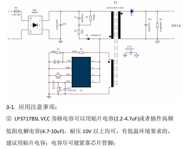 典型反激結構,但省掉了光耦和431——LP3717BSL通過原邊反饋(FB引腳)直接采樣輸出電壓。關鍵設計點: